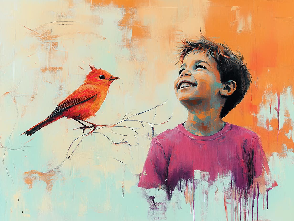 Unser Motiv – ein kleiner Junge, der mit einem Vogel spielt – dient als Ausgangspunkt, um verschiedene Stile und Techniken zu erkunden.