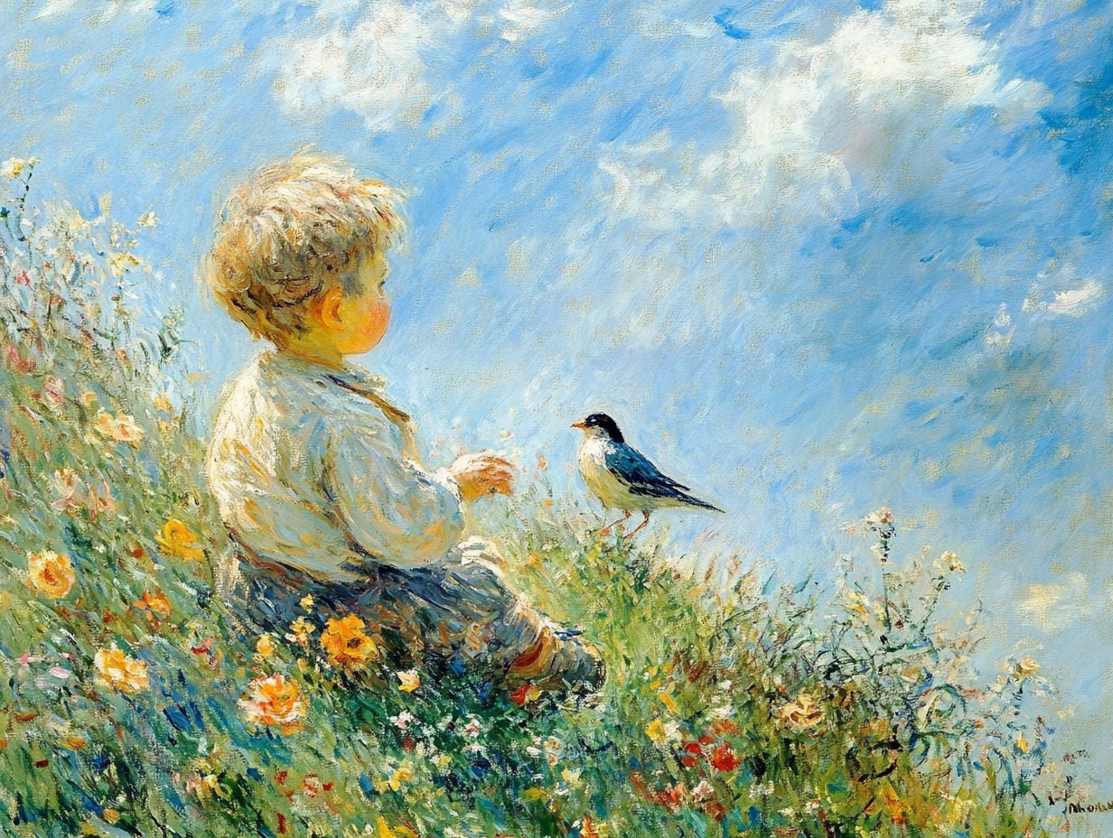 Cute little boy sitting in the nature, playing with a bird on a meadow with flowers, blue skies, by Claude Monet --ar 4:3 --style raw