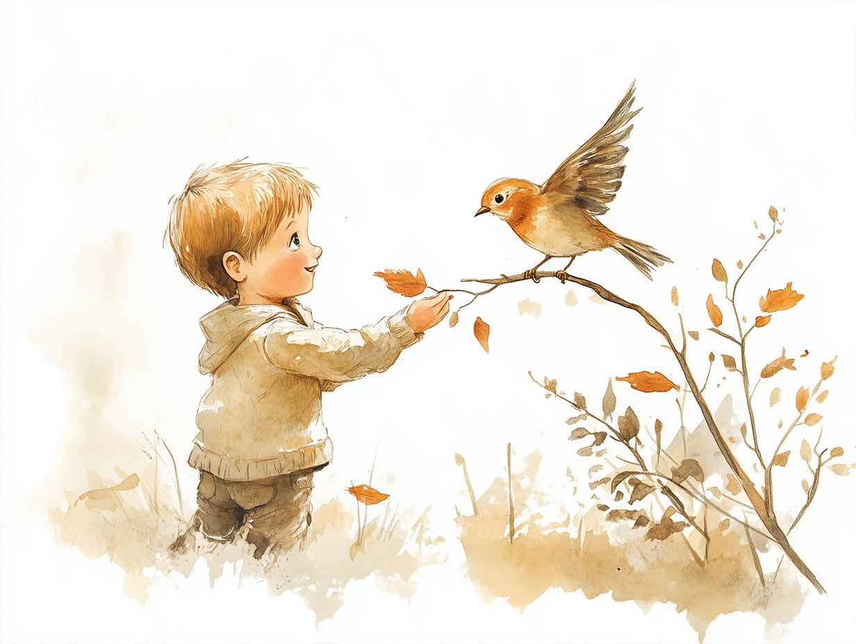 A small boy playing joyfully with a bird, children’s book illustration style, soft colors, warm and cheerful atmosphere, detailed, watercolor textures, hand-drawn look, dynamic composition --no text --ar 4:3