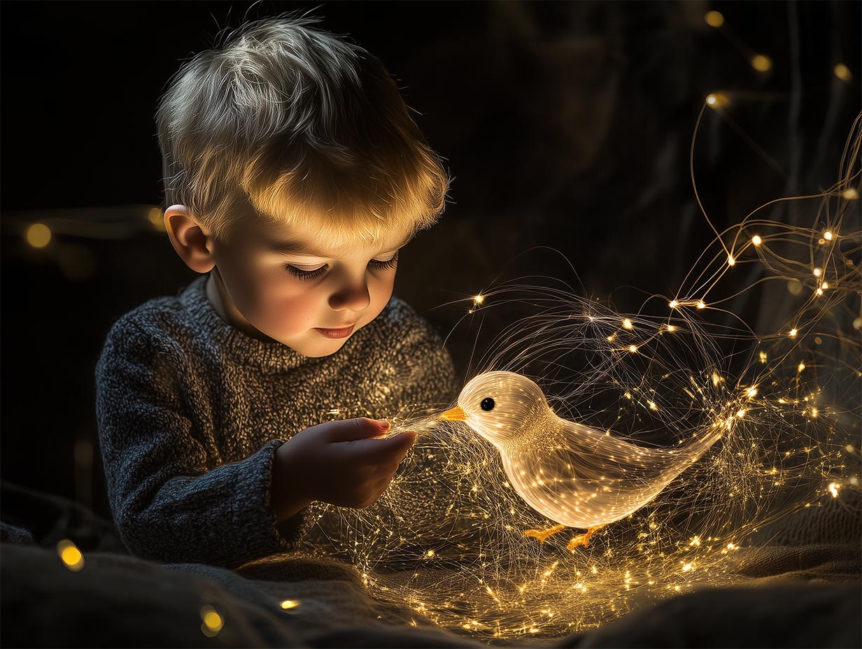 Cute little boy playing with a bird, Fiber optic light painting style --ar 4:3 --style raw