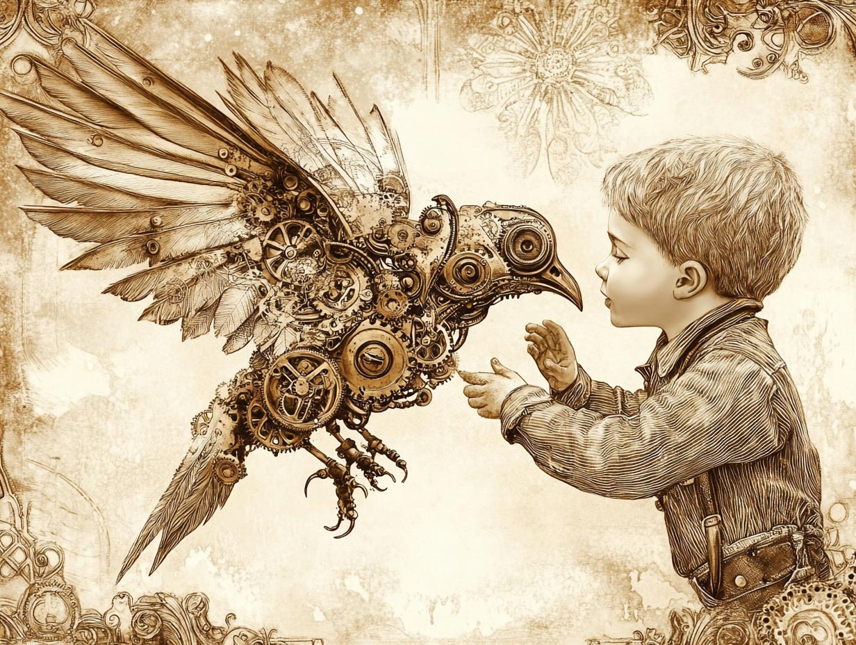 A small boy interacting with a mechanical bird, steampunk illustration, intricate brass details, gears and cogs, sepia tones, vintage aesthetic, whimsical Victorian atmosphere --ar 4:3