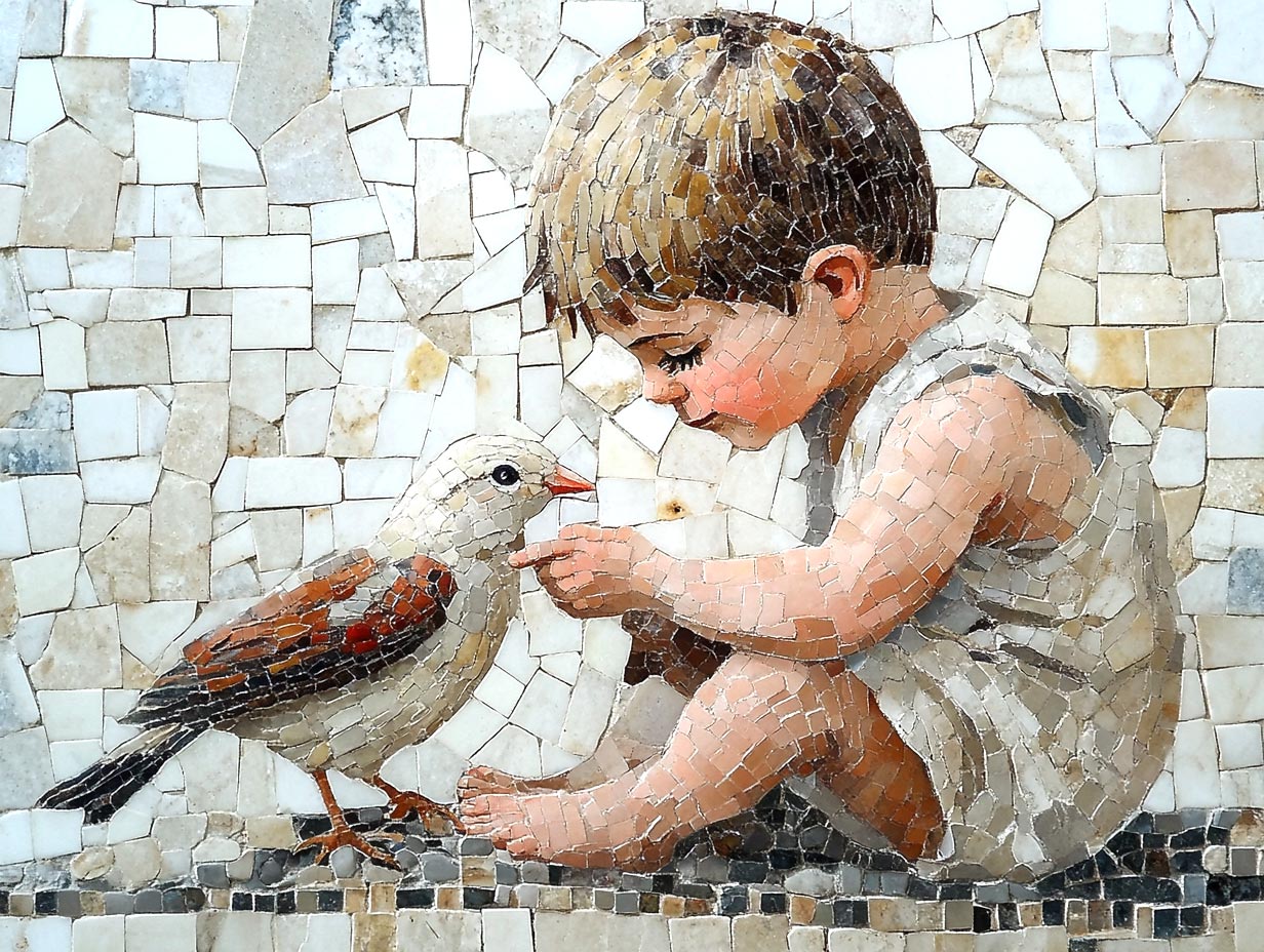 Mosaik of a cute little boy playing with a bird --ar 4:3