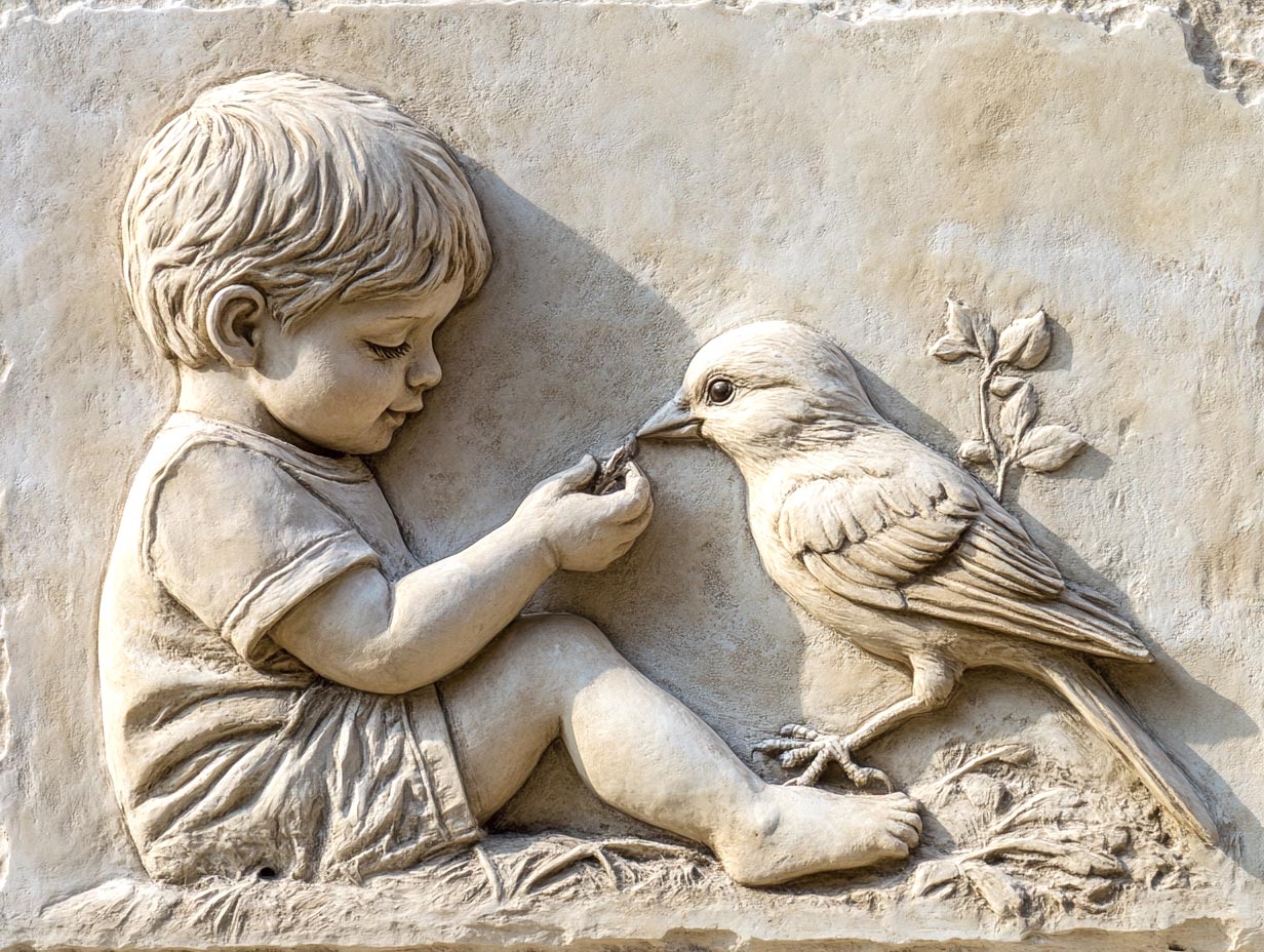 Relief of a cute little boy playing with a bird --ar 4:3