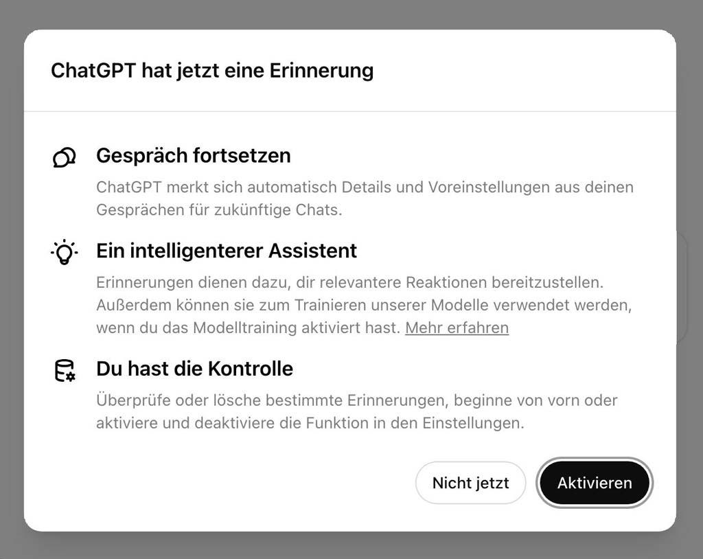 Neulich poppt bei ChatGPT eine neue Funktion auf: "Erinnerungen". Und da steht man nun, vor dieser digitalen Weggabelung: Aktivieren oder lieber Finger weg?