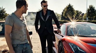 As the camera slowly pans from left to right, the difference between the two men – and their cars – becomes almost surreal.